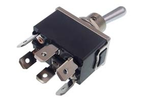 Standard size panel mounting toggle switch DPDT rated 10A 250VAc. Connection through push-on terminals.