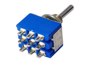 Miniature panel mounting 3PCO toggle switch with centre off position. Connection is through solder terminals.