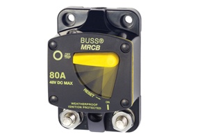 Single pole surface mounting thermal circuit breaker with a manual trip combining circuit breaker protection with switching functionality. Suitable for DC circuits up to 48Vdc.