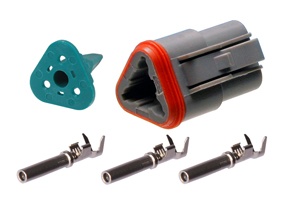 3-way AT series connectors for marine, automotive, heavy machinery, and agricultural applications. These in-line connectors are IP68 rated and offer high performance and high current carrying capacity.