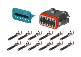 12-way AT series connectors for marine, automotive, heavy machinery, and agricultural applications. These in-line connectors are IP68 rated and offer high performance and high current carrying capacity.