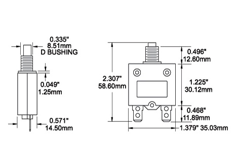 Single pole panel mount thermal circuit breaker push to reset. Suitable for DC circuits up to 32Vdc.