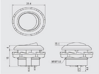 Round SPST rocker switch panel mounting with rear fixing plastic locking nut. Black body and actuator with I/O legend. Panel cutout 18.2mm dia. Solder terminals